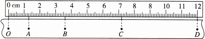 例2 在做“打点计时器测速度”的实验中,某同学用打点计时器打出了一条纸带。他从比较清晰的点起,选取了 $O$、$A$、$B$、$C$、$D$ 五个计数点,每相邻两计数点间还有 $4$ 个计时点图中未画出,打点计时器打点时间间隔为 $0.02s$,如图所示。下列问题(2)、(3)中计算结果均保留到小数点后两位。