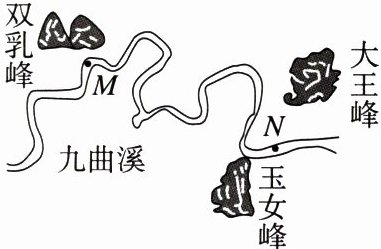 3. (2021·福建)一游客在武夷山九曲溪乘竹筏漂流,途经双乳峰附近的 $M$ 点和玉女峰附近的 $N$ 点,如图所示。已知该游客从 $M$ 点漂流到 $N$ 点的路程为 $5.4km$,用时 $1h$,$M$、$N$ 间的直线距离为 $1.8km$,则从 $M$ 点漂流到 $N$ 点的过程中(