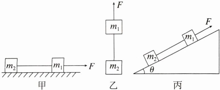 例 1 如图甲所示,两质量为 $m_{1}$、$m_{2}$ 的物块处于水平光滑面上,中间由轻绳相连,一个恒力 $F$ 作用在物体上,一起向右做匀加速运动。