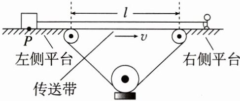 例 3 (2024·九省联考安徽省) 如图,相距 $l = 2.5m$ 的两平台位于同一水平面内,二者之间用传送带相接。传送带向右匀速运动,根据需要设定驱动系统的速度大小 $v = 1m/s$。质量 $m = 10kg$ 的货物 (可视为质点) 放在距传送带左侧 $1m$ 处的 $P$ 点,右侧平台的人通过一根轻绳用恒力 $F = 40N$ 水平向右拉货物。已知货物与平台间的动摩擦因数 $\mu_{1} = 0.2$,货物与传送带间的动摩擦因数 $\mu_{2} = 0.5$,假设最大静摩擦力等于滑动摩擦力,重力加速度 $g$ 取 $10m/s^{2}$。求: