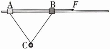 例 2 (2023·长春模拟) 如图所示,光滑粗细均匀的直杆水平固定,质量均为 $m$ 的 $A$、$B$ 两个滑环套在杆上,用长为 $L$ 的细线连接,用两根长也为 $L$ 的细线将质量也为 $m$ 的小球 $C$ 分别与滑环 $A$、$B$ 连接,不计滑环和小球的大小,重力加速度为 $g$,水平杆足够长,用水平向右的恒定拉力拉滑环 $B$ 向右加速运动,$A$、$B$、$C$ 保持相对静止,连接 $A$、$C$ 的细线刚好张力为零。求: