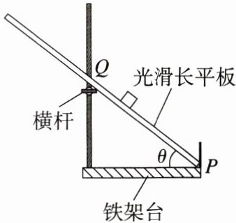 例 8 (2021·全国甲卷) 如图,将光滑长平板的下端置于铁架台水平底座上的挡板 $P$ 处,上部架在横杆上。横杆的位置可在竖直杆上调节,使得平板与底座之间的夹角 $\theta$ 可变。将小物块由平板与竖直杆交点 $Q$ 处静止释放,物块沿平板从 $Q$ 点滑至 $P$ 点所用的时间 $t$ 与夹角 $\theta$ 的大小有关。若 $\theta$ 由 $30^{\circ}$ 逐渐增大至 $60^{\circ}$,物块的下滑时间 $t$ 将 (