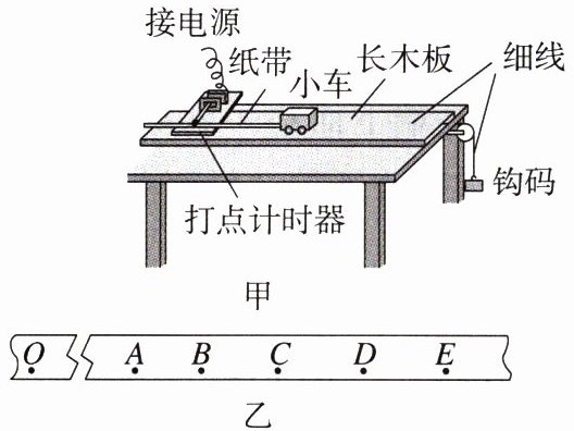 (2) 在某次实验中,打点计时器所用电源的频率为 $ 50 \, Hz $. 兴趣小组通过实验得到小车做匀变速直线运动的一条纸带如乙图所示,纸带上每相邻的两个计数点之间都有四个点未画出. 按时间顺序取 $ A $、$ B $、$ C $、$ D $、$ E $ 五个计数点,用刻度尺量出相邻点之间的距离是 $ x_{AB} = 5.19 \, cm $,$ x_{AC} = 10.89 \, cm $,$ x_{AD} = 17.10 \, cm $,$ x_{AE} = 23.82 \, cm $. 由此求得小车的加速度大小为