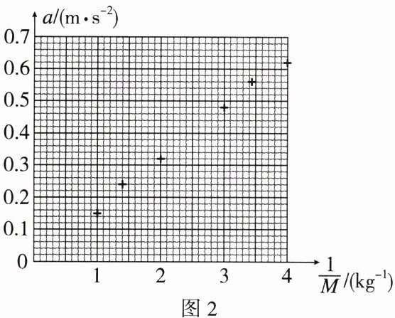 (2) 某同学为了定量验证(1)中得到的初步关系,设计实验并得到小车加速度 $ a $ 与质量 $ M $ 的 7 组实验数据,如下表所示. 在图 2 所示的坐标纸上已经描好了 6 组数据点,请将余下的一组数据描在坐标纸上,并作出 $ a - \frac{1}{M} $ 图像.