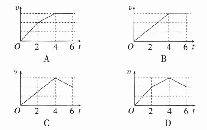 例2(2023·广东一模)如图所示,一质量为$m = 1.0\mathrm{kg}$的物体静置于粗糙的水平地面上,与地面间的动摩擦因数$\mu = 0.5$。$t = 0$时刻对物体施加一大小恒为$F = 10\mathrm{N}$的作用力,方向为斜向右上方且与水平方向成$53^{\circ}$角;$t = 2\mathrm{s}$时将该力方向变为水平向右;$t = 4\mathrm{s}$时又将该力变为斜向右下方且与水平方向成$37^{\circ}$角。下列$v-t$图像能反映物体在前$6\mathrm{s}$内运动情况的是($g$取$10\mathrm{m}/\mathrm{s}^{2}$,$\sin37^{\circ}=0.6$,$\cos37^{\circ}=0.8$)(