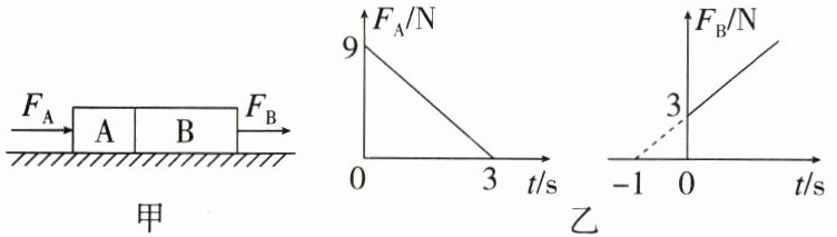 例3(2023·广东模拟)(多选)如图甲所示,A、B两个物体靠在一起,静止在光滑的水平面上,它们的质量分别为$m_{A} = 1\mathrm{kg}$,$m_{B} = 3\mathrm{kg}$,现用水平力$F_{A}$推A,用水平力$F_{B}$拉B,$F_{A}$和$F_{B}$随时间$t$变化关系如图乙所示,则(