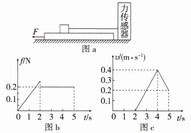 例5(2019·课标全国Ⅲ)(多选)如图a,物块和木板叠放在实验台上,物块用一不可伸长的细绳与固定在实验台上的力传感器相连,细绳水平。$t = 0$时,木板开始受到水平外力F的作用,在$t = 4\mathrm{s}$时撤去外力。细绳对物块的拉力f随时间t变化的关系如图b所示,木板的速度v与时间t的关系如图c所示。木板与实验台之间的摩擦可以忽略。重力加速度取$10\mathrm{m}/\mathrm{s}^{2}$。由题给数据可以得出(
