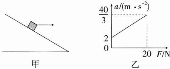 例6(2023·湖南模拟)(多选)如图甲所示,物体置于一固定的斜面上,与斜面间的动摩擦因数为$\mu$,对物体施加水平向右、大小变化的外力F,保持物体沿斜面向下做加速运动,加速度a随外力F变化的关系如图乙所示,物体不脱离斜面的条件是$F \leq 20\mathrm{N}$,若重力加速度g取$10\mathrm{m}/\mathrm{s}^{2}$,最大静摩擦力等于滑动摩擦力,根据图乙中所提供的信息,经过分析计算可以求出(