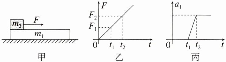 例4(2023·山东模拟)(多选)水平地面上有一质量$m_{1} = 3\mathrm{kg}$的长木板,木板的左端上有一质量$m_{2} = 2\mathrm{kg}$的小物块,如图甲所示,水平向右的拉力F作用在物块上,F随时间t的变化关系如图乙所示,其中$F_{1}$、$F_{2}$分别为$t_{1}$、$t_{2}$时刻F的大小,木板的加速度$a_{1}$随时间t的变化关系如图丙所示。已知木板与地面间的动摩擦因数为$\mu_{1} = 0.2$,物块与木板间的动摩擦因数为$\mu_{2} = 0.8$。假设最大静摩擦力均与相应的滑动摩擦力相等,重力加速度$g = 10\mathrm{m}/\mathrm{s}^{2}$,物块始终未从木板上滑落。则下列说法正确的是(