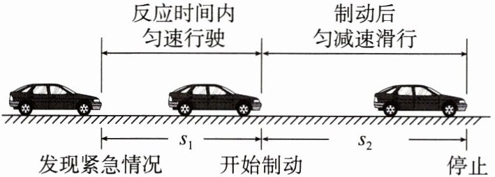 例2 ($2023\cdot$海南模拟)(多选)如图所示为汽车从发现紧急情况到开始制动到最后停止的运动模型,已知反应时间内的位移为$s_1$,匀减速的位移为$s_2$,下列说法正确的是(