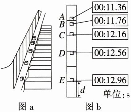 练5 ($2023\cdot$湖北模拟)(多选)如图$a$所示,某同学用智能手机拍摄物块从台阶旁的斜坡上自由滑下的过程,物块运动过程中的五个位置$A$、$B$、$C$、$D$、$E$及对应的时刻如图$b$所示。已知斜坡是由长为$d = 0.6m$的地砖拼接而成,且$A$、$C$、$E$三个位置物块的下边缘刚好与砖缝平齐。下列说法正确的是(