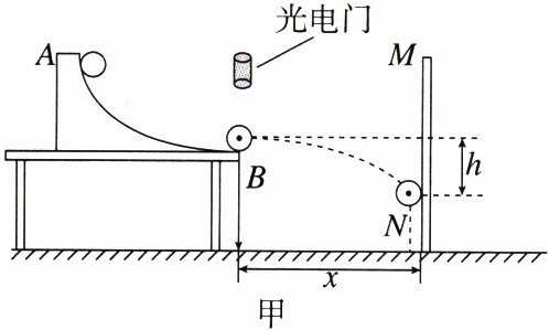 Ⅱ. 实验装置中固定轨道$AB$的末端水平,在轨道末端安装一光电门,光电门通过数据采集器与计算机相连,测量小球离开轨道时的速度.将小球从轨道的某高度处由静止释放,小球运动一段时间后,打到竖直记录屏$MN$上,记下落点位置.然后通过手机传感器的测距功能,测量并记录小球做平抛运动的水平距离$x$和竖直下落距离$h$;