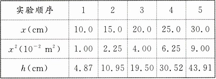 (2)小球过B点水平抛出的速度为$v_{0} = \frac{d}{t} = 1\ m/s$,$x^{2}$与$h$的关系为$x^{2} = \frac{2v_{0}^{2}h}{g}$,结合图像可得$\frac{2v_{0}^{2}}{g} = k = \frac{(9 - 1) × 10^{-2}}{0.4391 - 0.0487}\ m \approx 0.205\ m$,解得$g \approx 9.76\ m/s^{2}$。