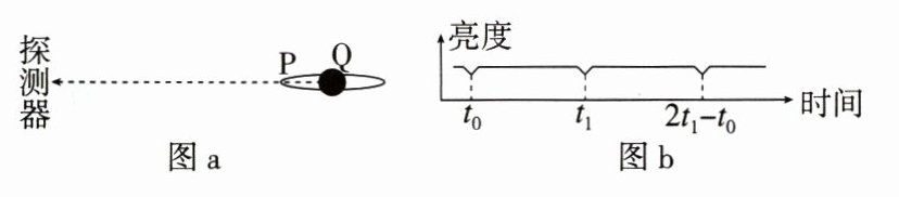 4. (2023·广东)如图a所示,太阳系外的一颗行星$P$绕恒星$Q$做匀速圆周运动。由于$P$的遮挡,探测器探测到$Q$的亮度随时间做如图b所示的周期性变化,该周期与$P$的公转周期相同。已知$Q$的质量为$M$,引力常量为$G$。关于$P$的公转,下列说法正确的是(