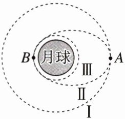 练7 (2024·云南模拟)(多选)如图所示为嫦娥五号探测器探月过程的示意图,先后在环月轨道Ⅰ、椭圆轨道Ⅱ、近月轨道Ⅲ上运行,$A$、$B$ 两点为变轨点,最终嫦娥五号稳稳落在月球表面,则下列说法正确的是(