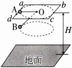 例 1 (2023·四川模拟)如图所示,水平放置的正方形光滑木板 $abcd$,边长为 $2L$,距地面的高度为 $H = 1.8m$,木板正中间有一个光滑的小孔 $O$,一根长为 $2L$ 的细线穿过小孔,两端分别系着两个完全相同的小球 $A$、$B$,两小球在同一竖直平面内。小球 $A$ 以角速度 $\omega = 2.5rad/s$ 在木板上绕 $O$ 点沿逆时针方向做匀速圆周运动时,$B$ 也在水平面内沿逆时针方向做匀速圆周运动,$O$ 点正好是细线的中点,其中 $L = 2m$,不计空气阻力,取 $g = 10m/s^{2}$。求: