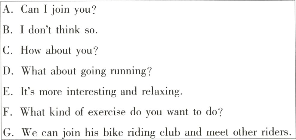 54. 根据上文A提到可以做像骑自行车这样的其他运动,E选项“I like bike riding, too.”(我也喜欢骑自行车。)符合语境,故填E。