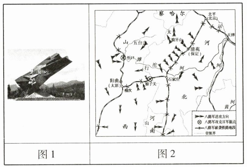 图2:在世界反法西斯战争连连失利,日军对中国敌后抗日根据地实行“囚笼政策”的背景下,中国共产党领导八路军于1940年8月至1941年1月发动大规模的百团大战。百团大战有力打击了日军的侵略气焰,提高了共产党和八路军的威望,振奋了全国军民争取抗战胜利的信心,体现了中国共产党领导下的革命大无畏精神和不怕牺牲、英勇战斗的顽强意志。(任选一幅进行解读,6分)