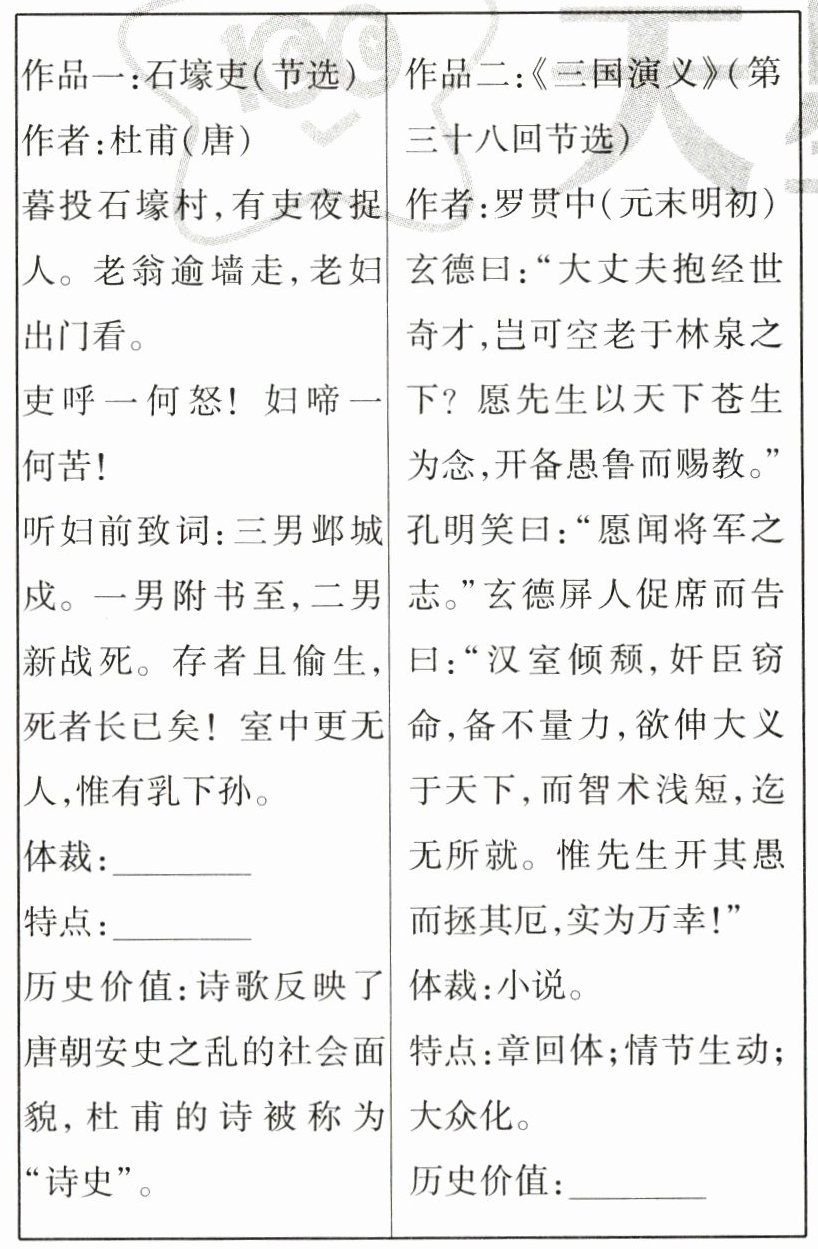 (1)体裁:诗歌。(1分)特点:诗风淳朴厚重,取材于社会现实,有“诗史”之称。(1分)历史价值:反映了东汉末年社会动荡的社会现实和人民群众渴望统一的愿望;推动历史演义小说的繁荣。(2分)