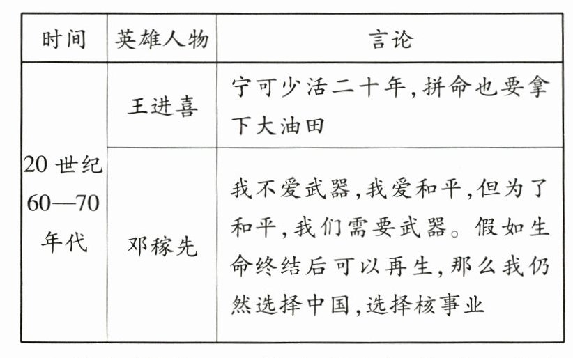 (2)时代主题:1840—1949年:救亡图存。20世纪60—70年代:社会主义建设。(4分)认识:杰出人物推动历史进步;民族英雄的事迹彰显民族气节,涵养家国情怀。(任答一点,其他答案言之有理亦可,2分)