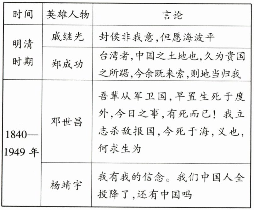 (1)结合所学知识,简述戚继光、郑成功的言论反映的英雄事迹及其意义。(4分)