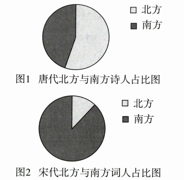 分析材料可知,唐朝时,诗人的籍贯主要分布在北方,到宋朝时词人的籍贯主要集中在南方,且南方词人在词人中的占比远远超过北方。