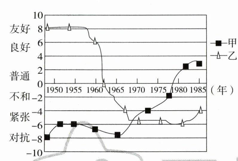 9.新课标跨学科 下图反映了1950 - 1985年中国与部分国家的关系变化。图中甲、乙两国分别是( )