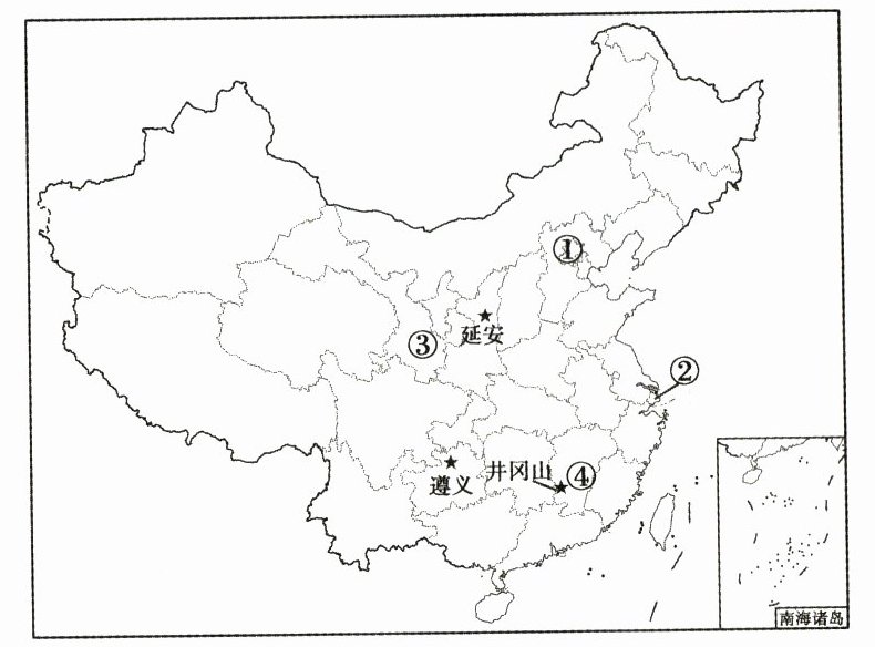 (1)中国共产党“28年浴血奋斗”开始于图中__________处,完成于__________处;中国工农红军“屈指行程二万五”的长征开始于图中__________处,并于__________处完成会师。(请填写序号,4分)
