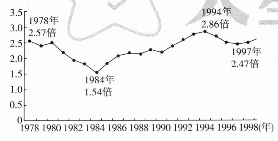 10. 下图反映的是1978—1998年中国城乡收入差距变化趋势(来源于《中国劳动统计年鉴》)。关于图中曲线变化的主要背景,以下解读正确的是 ( )