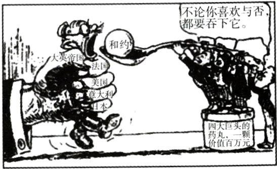 答案:A。根据漫画中文字信息“大英帝国”“法国”“美国”“不论你喜欢与否,都要吞下它”等可知,漫画中被大手握住的人代表的是德国,漫画中的“和约”指的是《凡尔赛条约》,漫画反映的是一战德国战败,协约国与德国签订了《凡尔赛条约》。故选A。