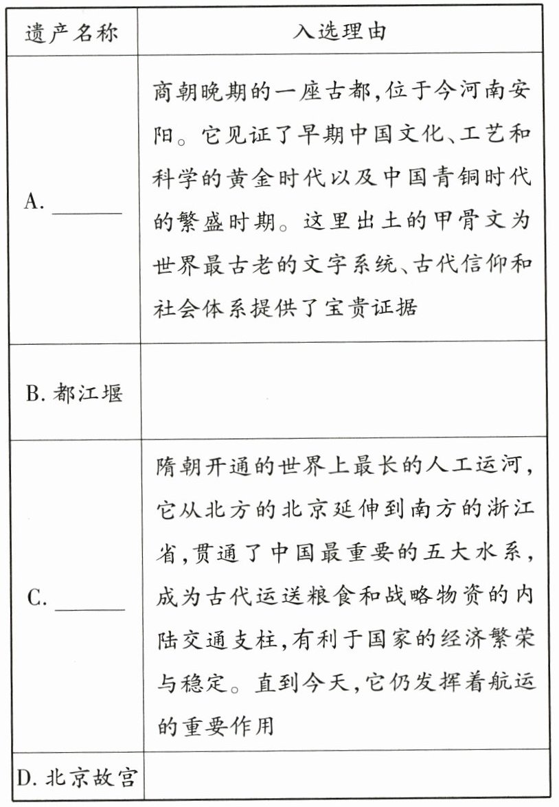 (2)结合所学知识,从B、D中任选一项,撰写其入选《世界遗产名录》的理由。(6分)