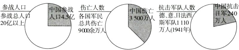 根据饼状图可知,在第二次世界大战中,中国参战人口多,伤亡巨大,抗击敌军人数多。