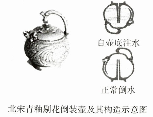 注:该壶利用了虹吸原理,注水孔在壶底,注水时,水并不会从壶嘴流出。水壶翻转后,水也不会从壶底漏出,只有当壶身向壶嘴处倾斜时,水才会自然流出,这增加了壶的密封性和便携性,后来该类壶普遍流行。