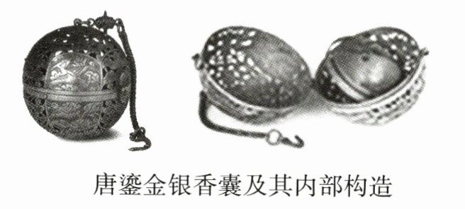 注:该香囊利用了陀螺仪万向支架原理,无论如何转动,中间焚香的盂始终保持水平状态,焚香都不会倾洒;外壳通体镂空,便于香气散出,且可随身挂佩,在唐朝风靡一时。