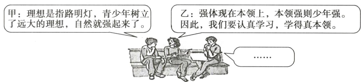 (3)两位同学的观点都是片面的。青年一代有理想、有本领、有担当,国家就有前途,民族就有希望。(1分)青少年树立远大理想,能够帮助自己确立人生目标,不断激发生命的热情和勇气,青少年为之努力奋斗,使自己强大起来;(1分)青少年认真学习,掌握科学文化知识,学得真本领,才能不断增强自身的素质,提升建设祖国和服务社会的能力,不断强大自己;(1分)青少年还需要增强担当精神,勇于承担责任,展示自己的才干,使自己的潜能得到充分挖掘和发挥,才有资格、有能力、有信心承担起时代和国家所赋予的使命,做一个强大的中国青少年。(1分)(提示:学生若从不仅强在有执着的信念、过硬的本领,还强在有优良的品德、丰富的知识等角度作答,也可酌情给分)