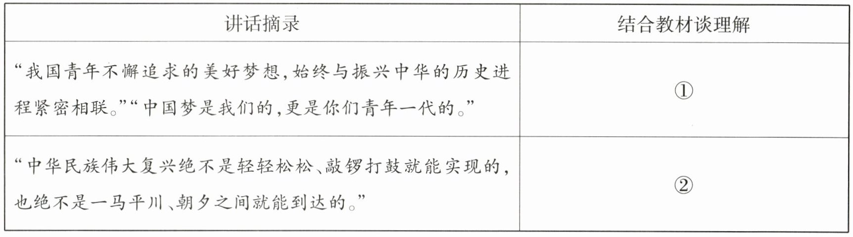 (2)问,第一则摘录的关键词是“青年”和“梦想”,可以结合教材中少年的梦想、中国梦等知识回答;第二则摘录的主旨是中华民族伟大复兴任重道远,可以结合青年的地位、为实现中国梦接续奋斗等知识回答。