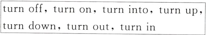 1. turns on 2. turning off 3. turning down 4. turn into 5. turned out 6. turn in