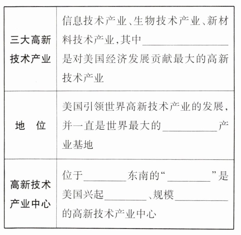2.特点:工业部门体系完整、门类齐全,生产规模大,技术先进,______、______、机械、化工等工业在世界上占重要地位,______和______处于世界领先地位。3.主要工业区