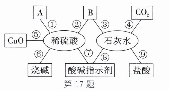 17. (5分)某实验中学的同学归纳总结了有关酸和碱的化学性质的知识网络(如图所示)。其中A是金属铝,B是一种常见的化合物,图中“—”表示两种物质在一定条件下可以发生化学反应。请根据图示回答有关问题。