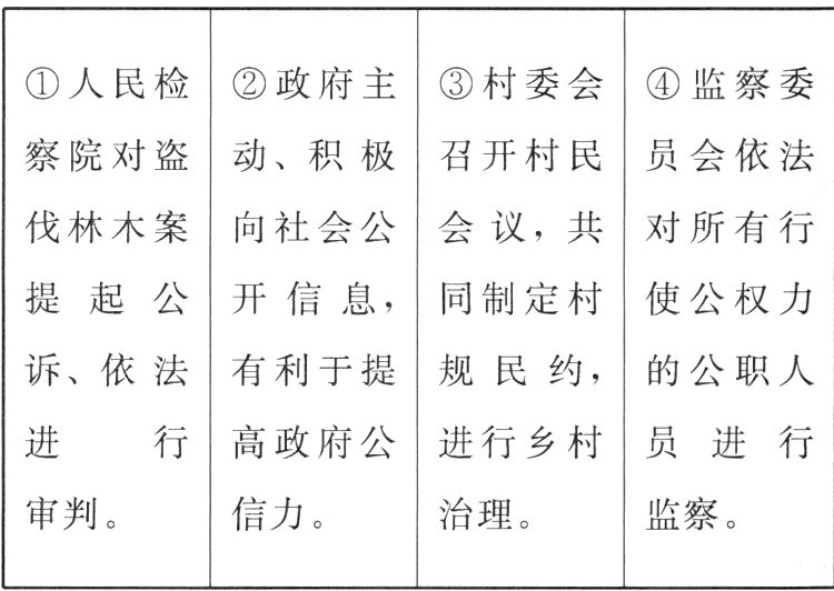 D 本题考查国家机关。①错误,人民法院依法行使审判权;②正确,政府主动、积极向社会公开信息,有利于提高政府公信力;村委会属于基层群众性自治组织,③不符合题意;④正确,监察委员会依法对所有行使公权力的公职人员进行监察,行使监督职责。故选D。