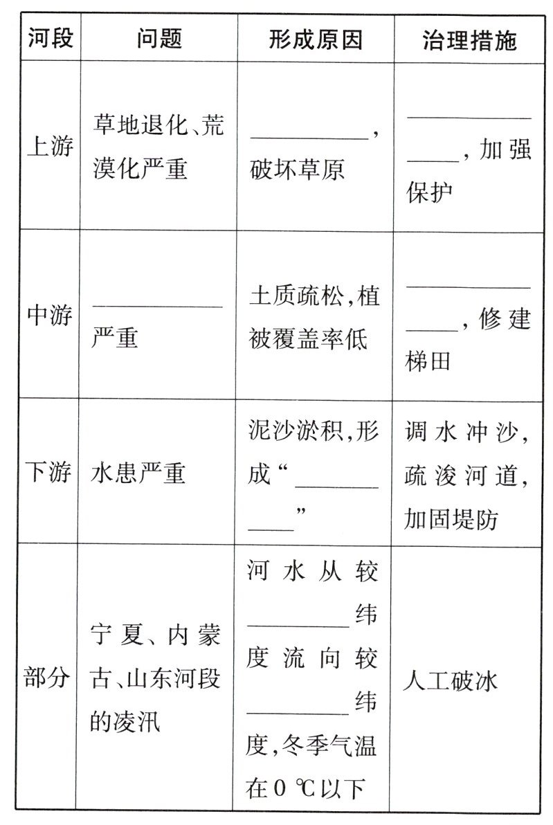 @@水能@@灌溉@@宁夏平原、河套平原@@凌汛@@排沙、防洪、发电@@含沙量@@地上河@@山东@@过度放牧@@合理放牧@@水土流失@@植树种草@@地上河@@低@@高