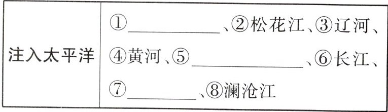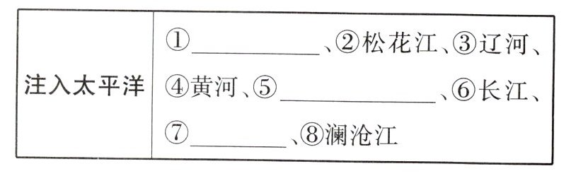 外流@@内流@@东部季风区@@降水@@短@@有@@大@@长@@小@@无@@气温@@黑龙江@@淮河@@珠江@@雅鲁藏布江@@额尔齐斯河@@塔里木河@@津@@鲁@@浙@@黄河@@长江@@最长