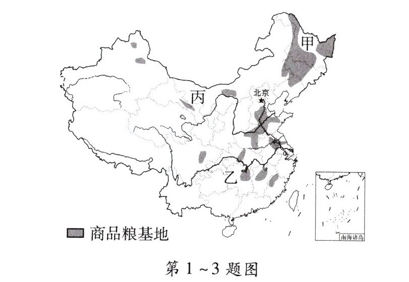 2. 甲、乙、丙三商品粮基地农业生产条件的叙述正确的是( )