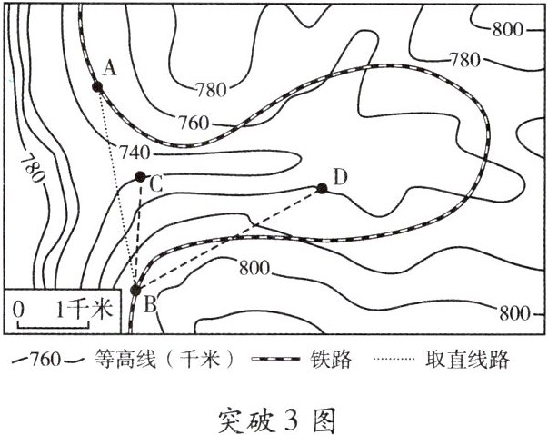 突破 3 [2024·长春]如图为某地等高线地形图与铁路线分布图,AB 两点图上直线距离约为 3 厘米,则两点的实地直线距离约为( )