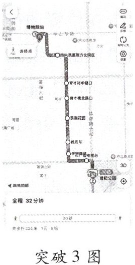 突破 3 [2024·河北模拟]2024 年五一假期,家住石家庄的小林同学计划到河北省博物院参观游览,如图示意小林同学用手机查询的交通出行信息。据此,完成 1~3 题。