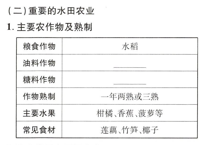 3.南方地区农产品种类繁多,食材丰富的原因:南方地区 气候 、 地形 、 生物 等资源丰富,地形多样,河汊纵横,大小湖塘星罗棋布,生物资源丰富,种植业、畜牧业、渔业等各农业部门的发展条件都很优越,因此南方地区农产品种类繁多,食材丰富。