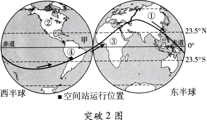 突破 2 [2024·新疆]天宫空间站是我国自主研发距地 400 千米~500 千米绕地飞行的空间站系统。读天宫空间站某时刻运行位置和轨迹图,完成 1~2 题。