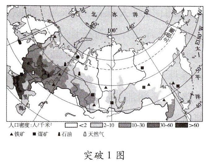 突破 1 [2024·滨州]2023 年俄罗斯通过升级基础设施等措施,吸引中国投资者共同开发西伯利亚地区。读“俄罗斯人口密度及部分资源分布图”,完成 1~2 题。