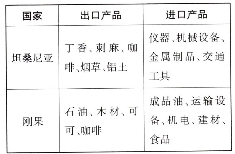 (5)阅读坦桑尼亚、刚果两国主要进出口产品表,分析坦桑尼亚、刚果两国在国际贸易中的特点。