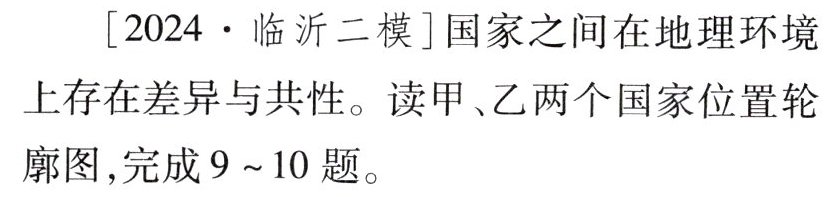 [2024·临沂二模]国家之间在地理环境上存在差异与共性。读甲、乙两个国家位置轮廓图,完成9~10题。